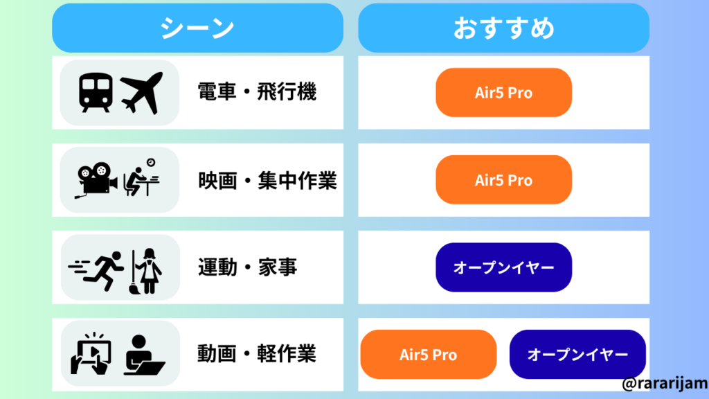 一方で運動や家事等のシーンでは耳を塞がないオープンイヤーが安全で快適。